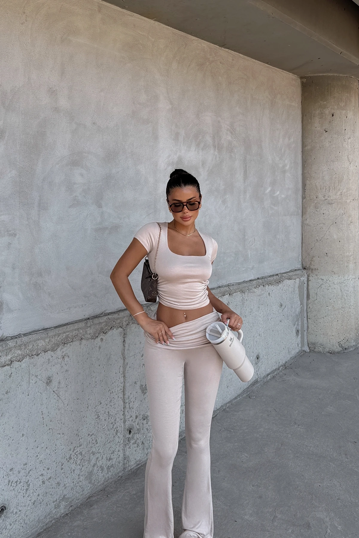 Beige Trouser Suit Size S is used in the image. It is made of single jersey fabric. Suit top length 45 cm, Chest 31 cm, Bottom length 104 cm, Waist 32 cm ​ Model Measurements Height: 160 Weight: 50 Chest: 80 Waist: 62 Hip: 94