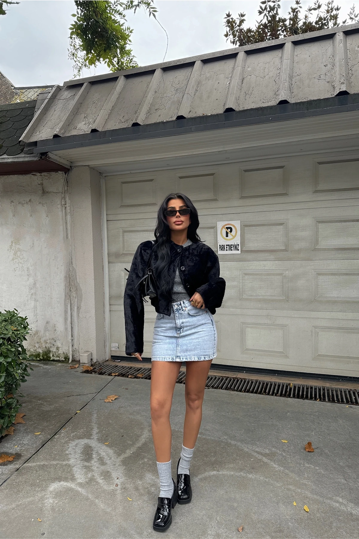 Black Button Detail Jacket Size XS is used in the image. Height: 50 cm Bust: 54 cm Model Measurements Height 158 ​​Weight 52 Chest 80 Waist 62 Hip 93