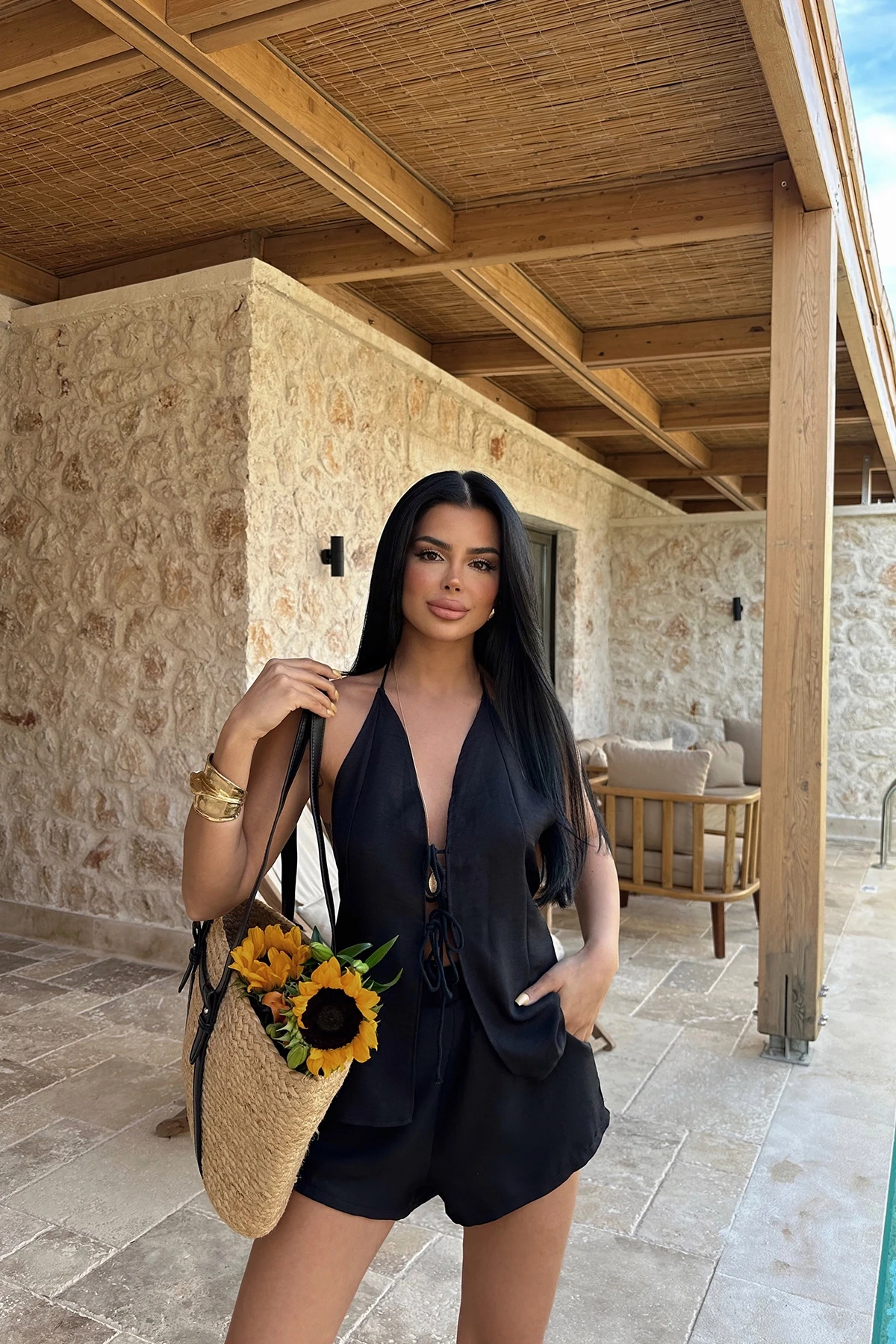 Black Candida Linen Set It is made of cotton fabric. Size S is used in the image. Top length: 52 cm, Chest 36, Waist 28 cm, Bottom length 42 cm Model Measurements Boy: 160 Weight: 50 Chest: 80 Waist: 62 Hip: 94