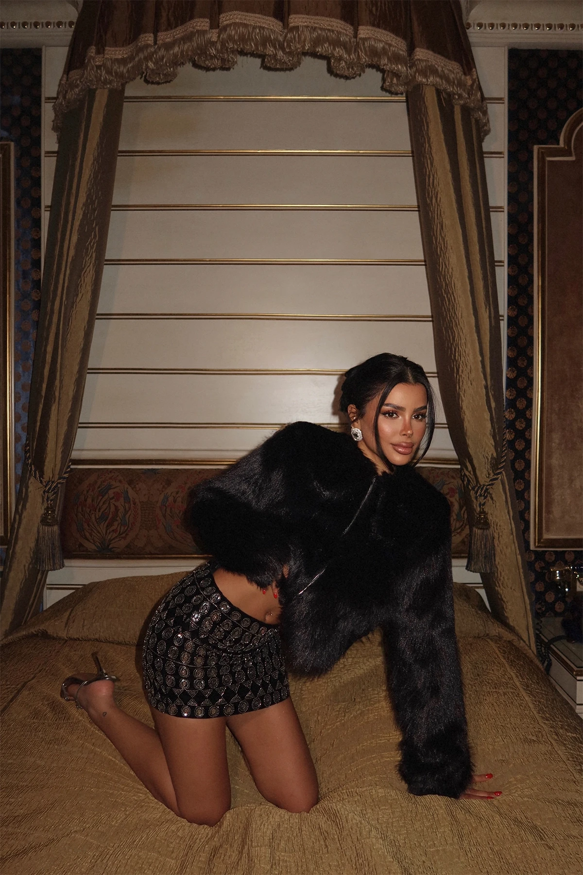 Black Fausta Fur The image uses size XS. Height: 53 cm Chest: 69 cm Model Measurements Height 158 ​​Weight 52 Chest 80 Waist 62 Hip 93