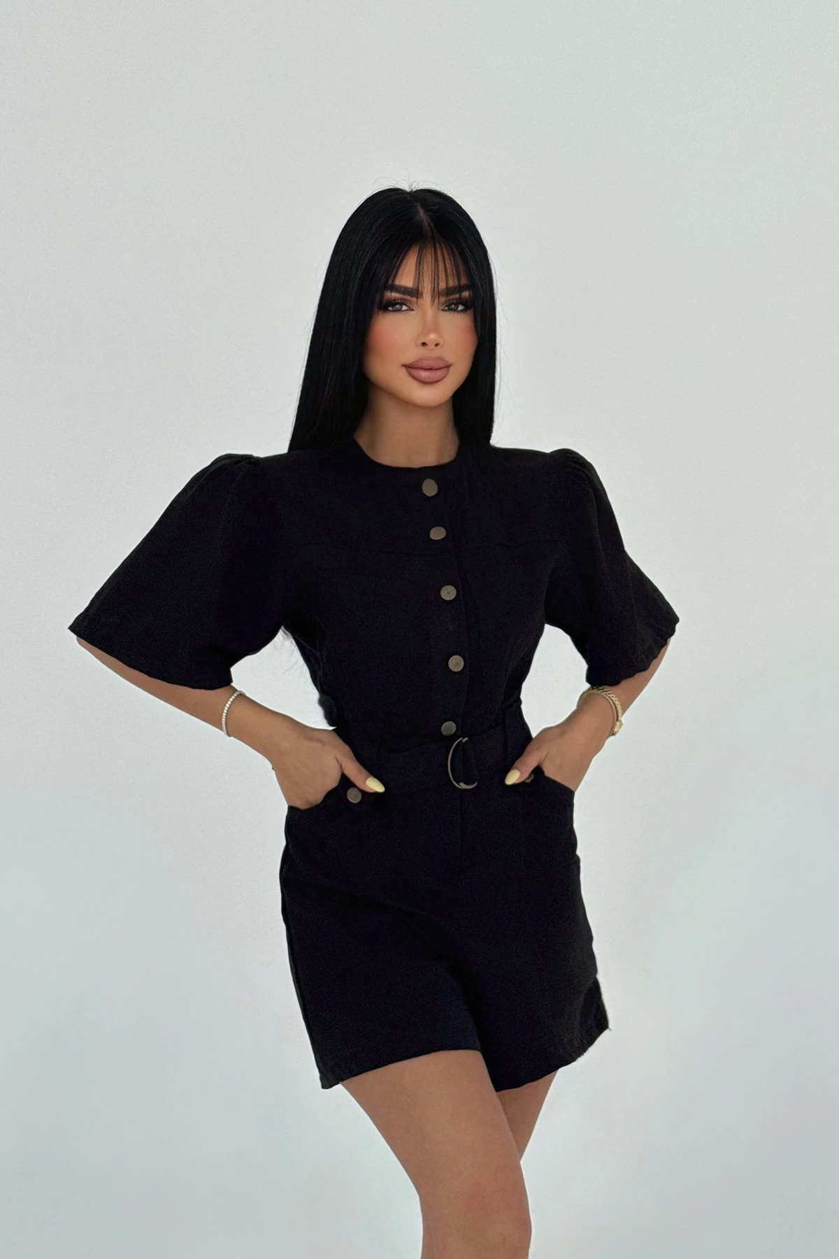 Black Pocket Detail Buttoned Jumpsuit The image uses size XS. Length: 84 cm Waist: 46 cm Chest: 30 cm Model Measurements Height 158 ​​Weight 52 Chest 80 Waist 62 Hip 93