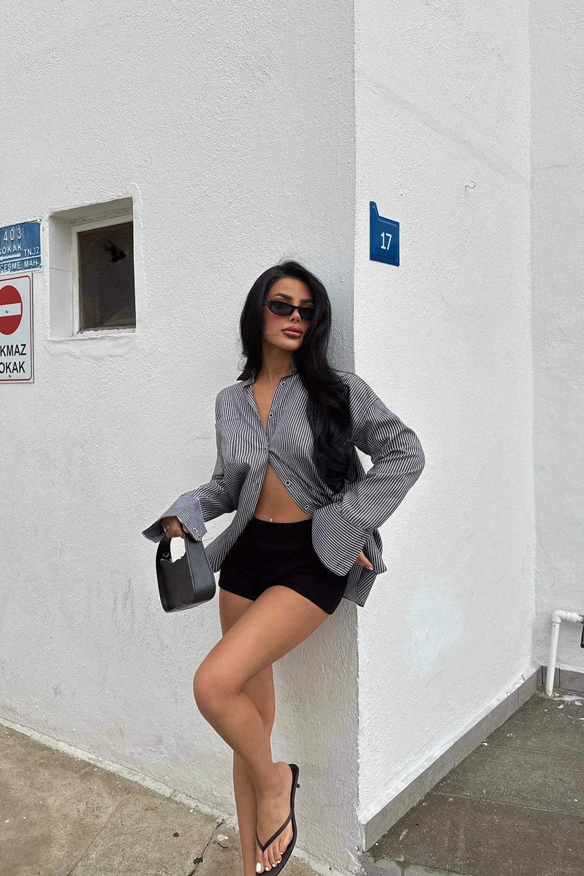 Black Romi Striped Shirt Made of Striped Fabric. Length: 77 cm Chest: 51 cm XS size is used in the image. Model Measurements Height 158 ​​Weight 52 Chest 80 Waist 62 Hip 93
