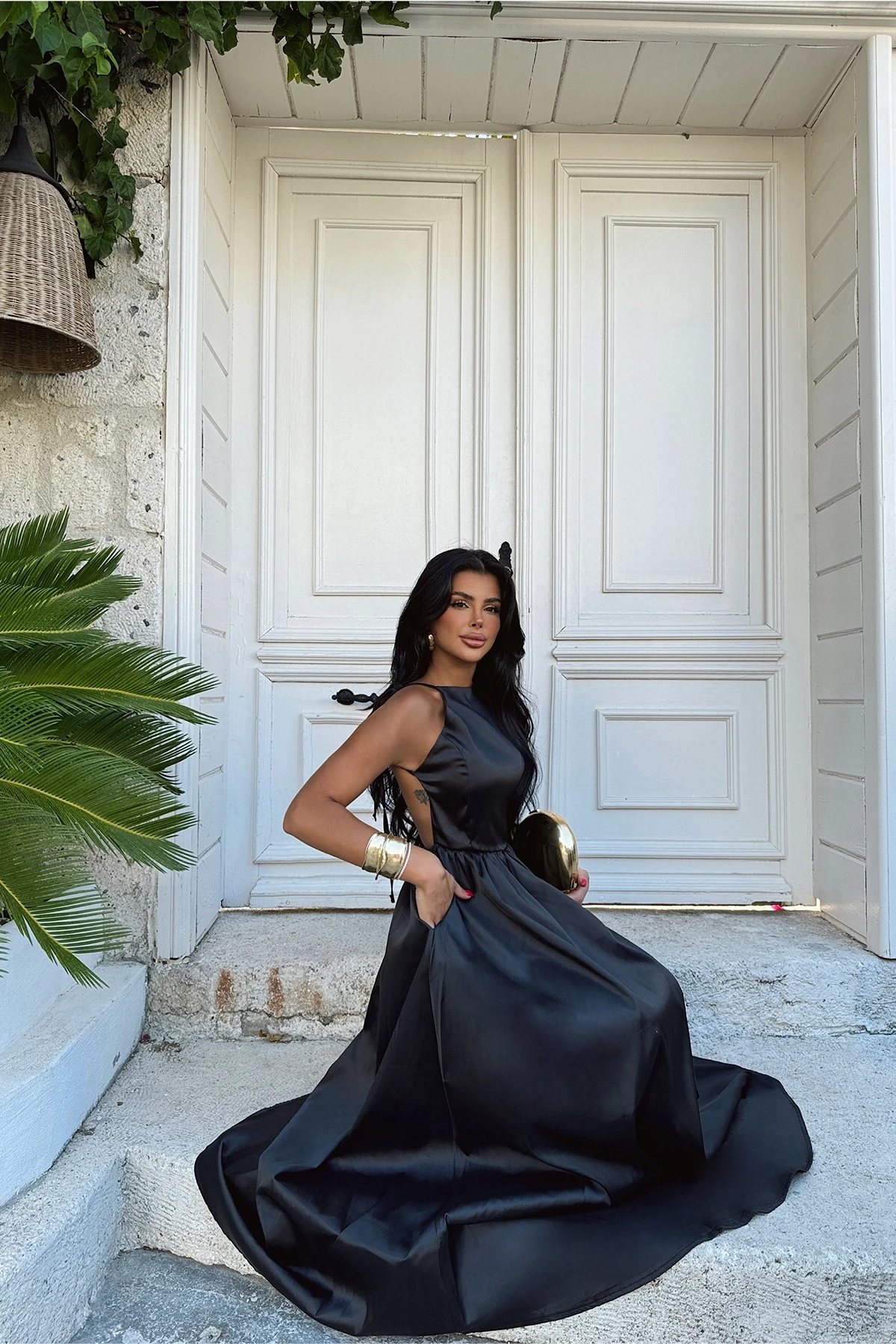 Black Satin Back Detail Long Dress Made from satin fabric. Size S is used in the image. Dress Length: 136 Cm, Chest: 35 Cm, ​​Waist: 30 Cm, Hips: 67 Cm Model Measurements: Height: 160 Weight: 50 Chest: 80 Waist: 62 Hip: 94