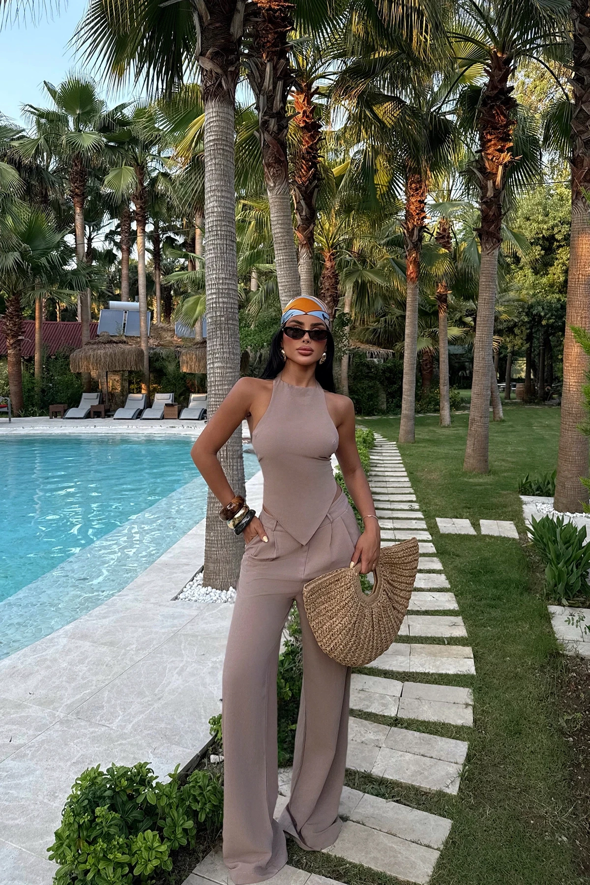 Brown Trouser Suit XS size is used in the image. Upper Length: 54 cm Chest: 28 cm Waist: 35 cm Bottom Length: 104 Model Measurements Height 158 ​​Weight 52 Chest 80 Waist 62 Hip 93