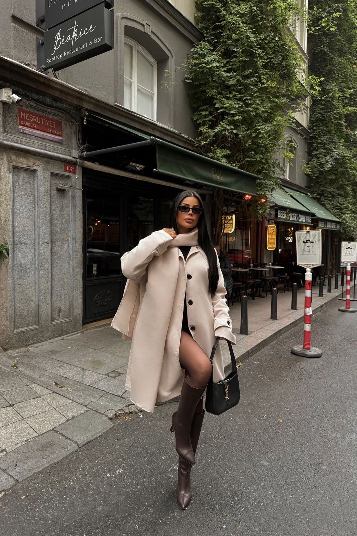 Cream Front Buttoned Belt Detail Trench Coat Size XS is used in the image. Height: 90 cm Bust: 61 cm Model Measurements Height 158 ​​Weight 52 Chest 80 Waist 62 Hip 93