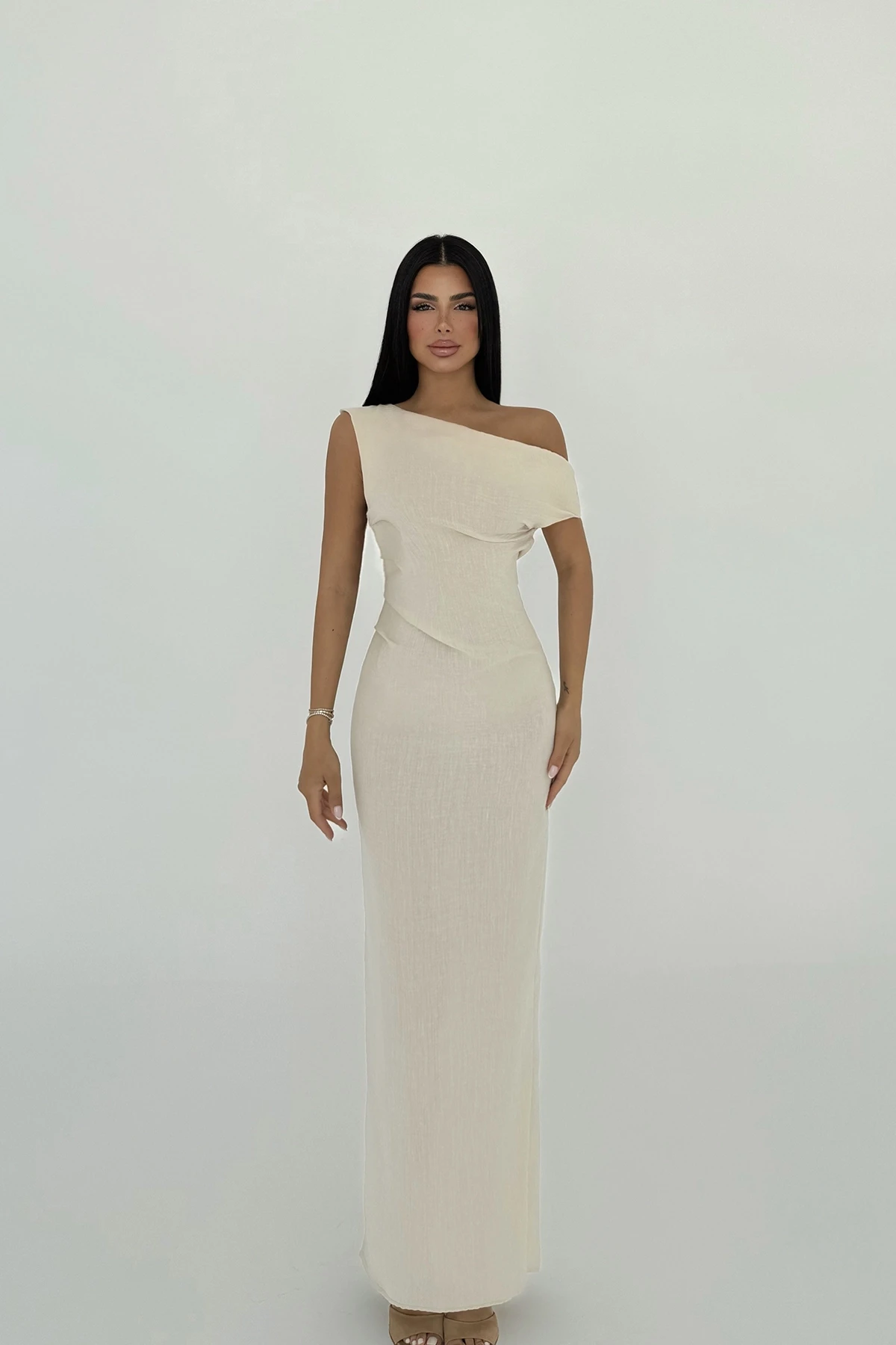 Cream Slit Detail Pleated Dress XS size is used in the image. Made of Suzi Linen Fabric. Length: 132 cm Waist: 35 cm Chest: 38 cm Model Measurements Height 158 ​​Weight 52 Chest 80 Waist 62 Hip 93