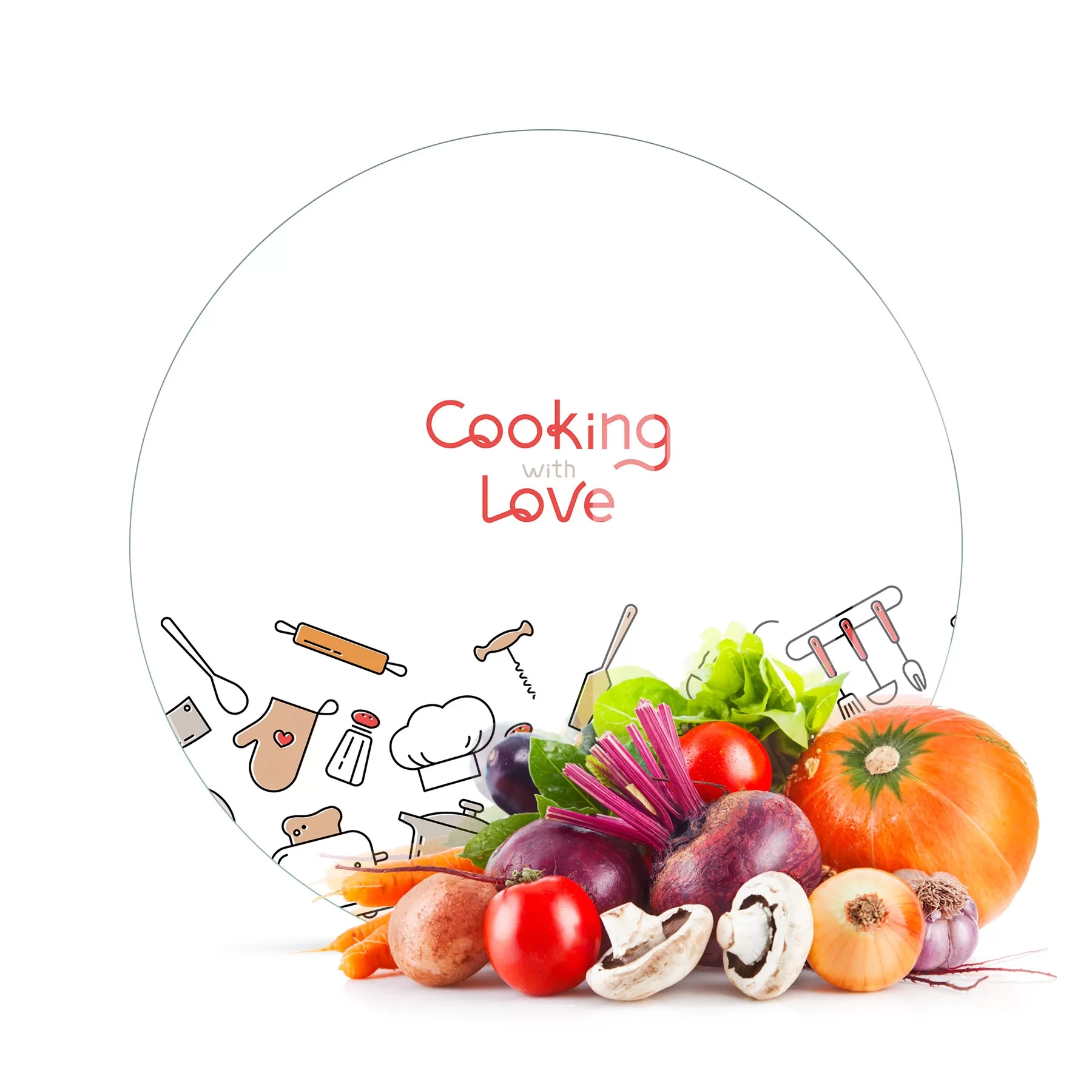 Decovetro Cam Kesme Tahtası ve Sunumluk Yuvarlak Cooking Love Desenli 30x30 Cm