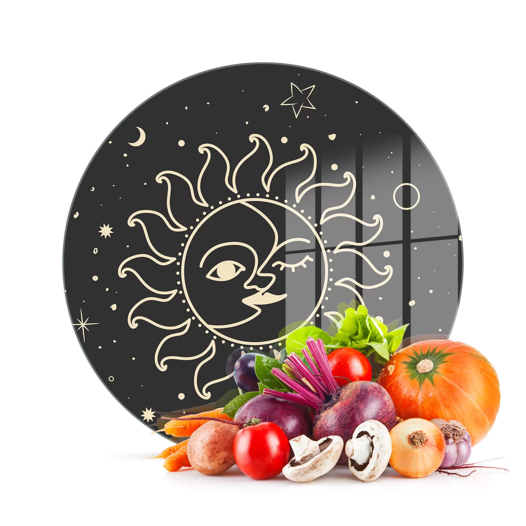 Decovetro Cam Kesme Tahtası ve Sunumluk Yuvarlak Horoscope Ay Güneş Desenli 30x30 Cm