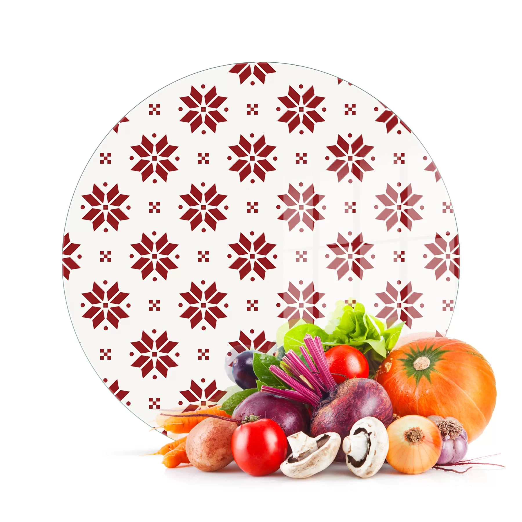 Decovetro Cam Kesme Tahtası ve Sunumluk Yuvarlak Kırmızı Kar Tanesi Desenli 30x30 Cm