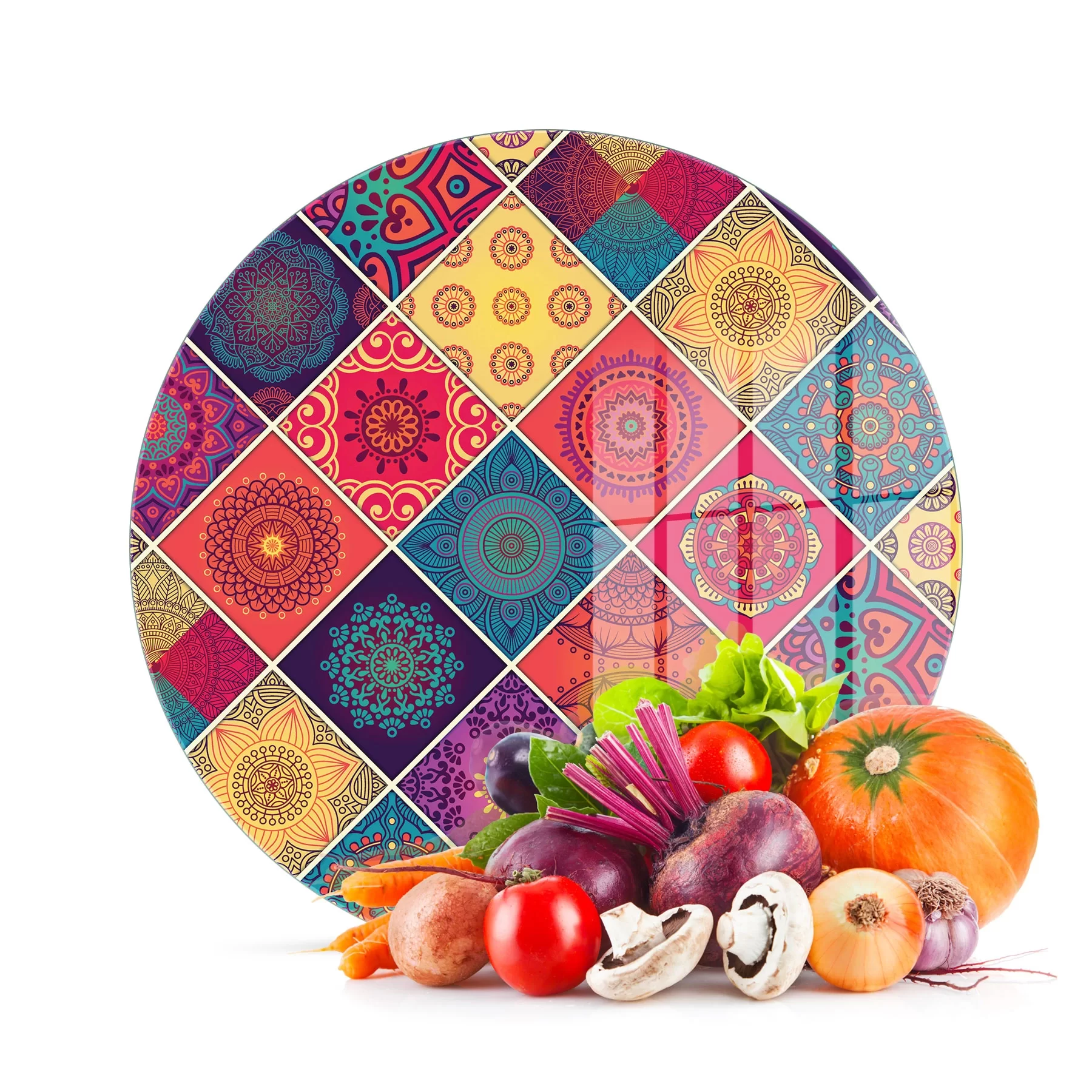 Decovetro Cam Kesme Tahtası ve Sunumluk Yuvarlak Karma Mandala Desenli 30x30 Cm