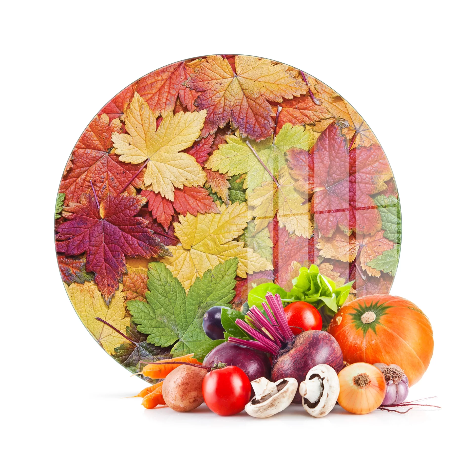 Decovetro Cam Kesme Tahtası ve Sunumluk Yuvarlak Sonbahar Yaprak Desenli 30x30 Cm