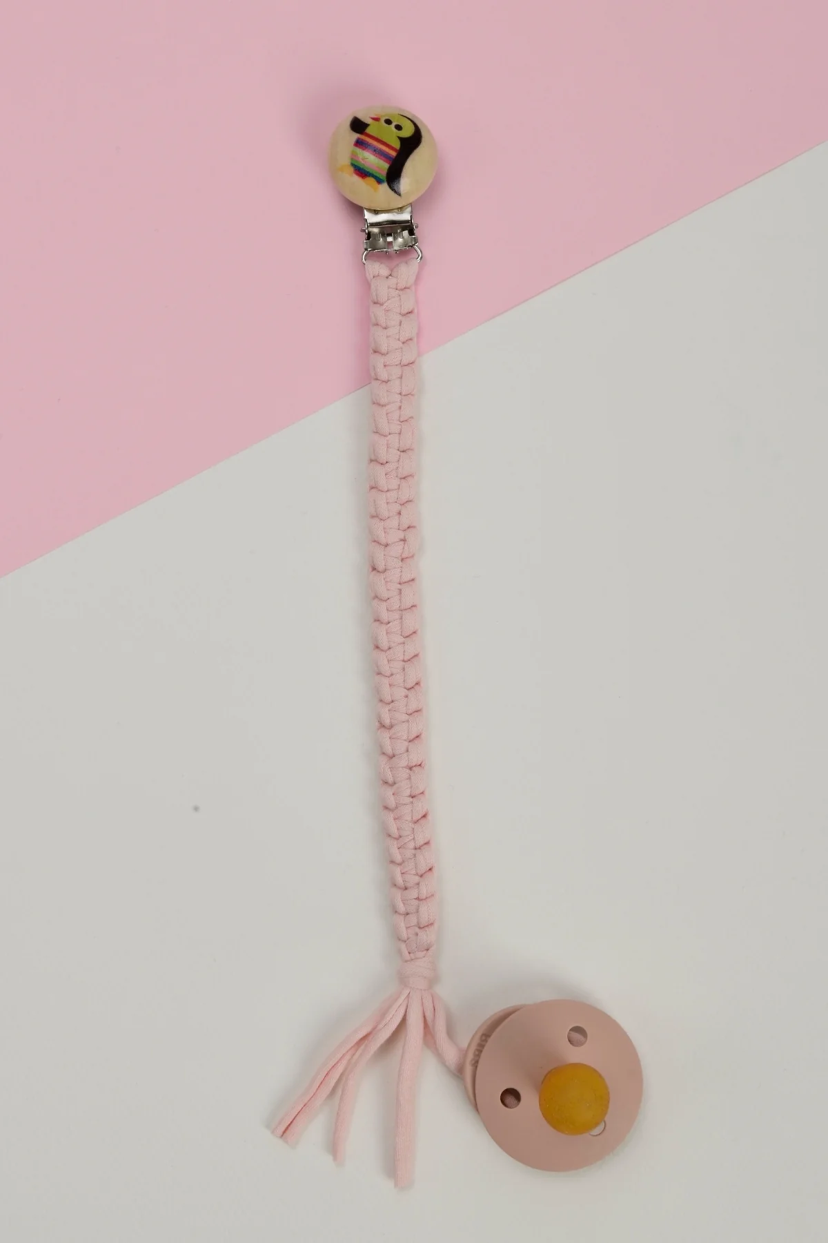 El Örmesi Doğal Ahşap Emzik Askısı - Penguen - Pembe
