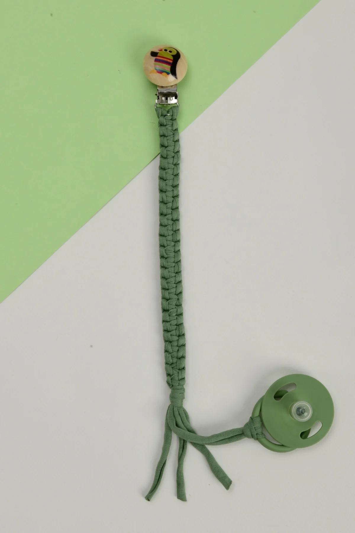 El Örmesi Doğal Ahşap Emzik Askısı - Penguen - Yeşil