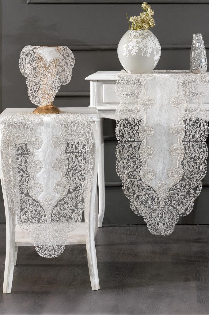 Fransız Güpürlü Lüks 5 parça Salon Takımı Marka: Çeyiz Diyarı Runner:130 x 37 cm / 1 adet Konsol : 45 x 27 cm / 2 adet Runner: 85x35 cm / 2 adet Kadife Kumaştan Üretilmiştir. Fransız Güpürü İle Şık Bir Tasarım Oluşturulmuştur. YIKAMA TALİMATI -Makinada veya elde yıkayabilirsiniz max 40 derecede yıkayınız. -Çamaşır suyu ile leke sökücü kimyasallar kullanmayınız. -Yıkama esnasında koyu renkleri mümkün olduğunca ayrı tutunuz. -Ilık ütü ile ütüleyiniz. -Islak bekletmeyiniz. -Kurutma makinasında kurutulabilir.