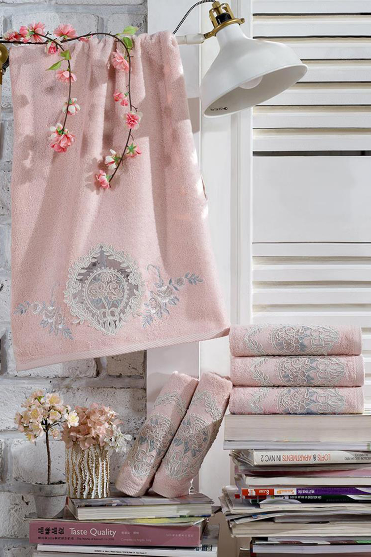 Fransız Güpürlü Nakışlı Gonca Çeyizlik Bambu Havlu Pudra