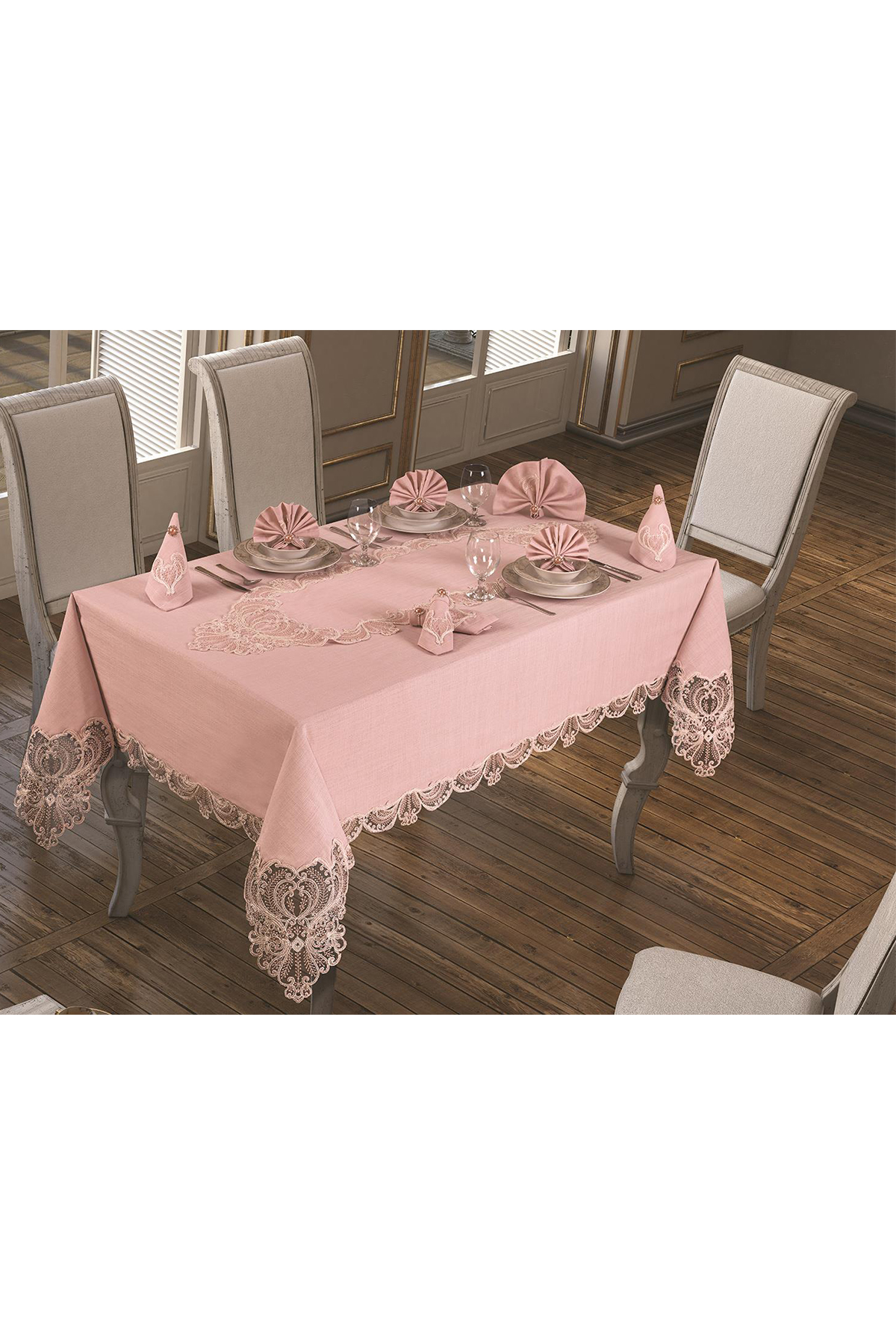 Fransız Güpürlü Yasemin Masa Örtüsü Takımı 18 Parça Pudra