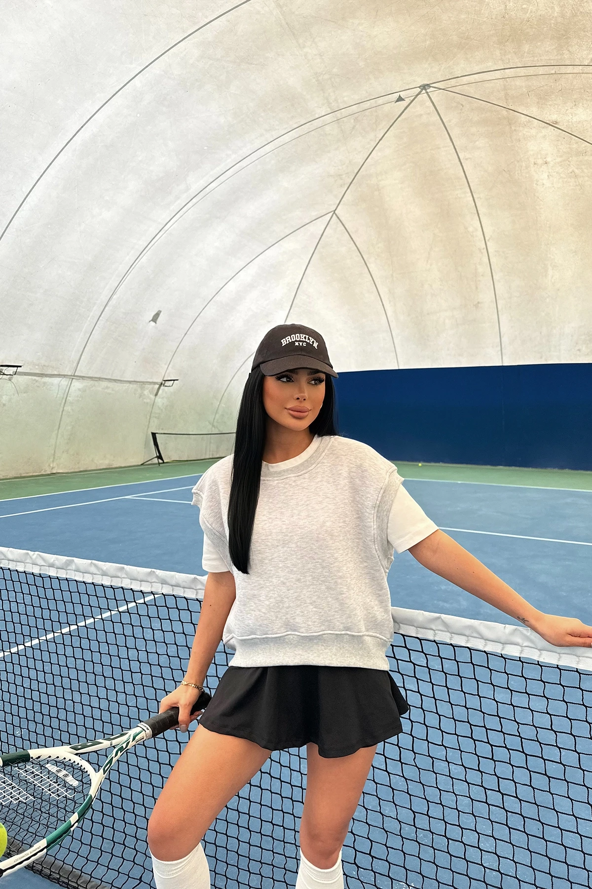Gray Alice Zero Sleeve Sweat Made from Three Thread Raised Fabric Size S is used in the image Length:51cm Chest:54cm Model Measurements Height: 160 Weight: 50 Chest: 80 Waist: 62 Hip: 94