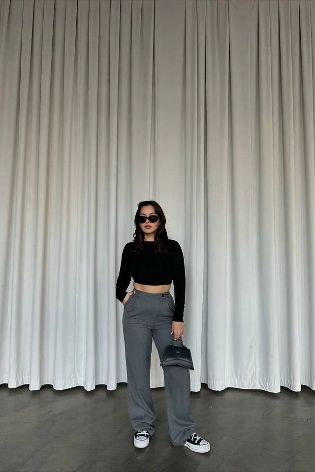 Gray Palazzo Cross Button Trousers Made from woven fabric. Size S is used in the image. Pants Length 115 cm, Waist 35 cm Model Measurements Height 160 Weight 54 Chest 80 Waist 60 Hip 97