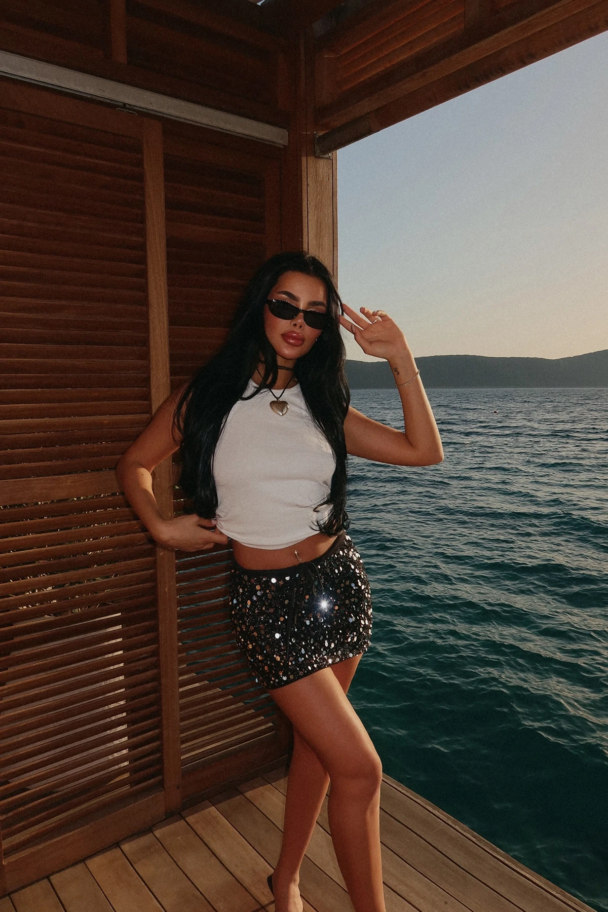Gray Tied Mini Skirt The image shows size XS. Made of Sequin Fabric. Height: 33 cm Waist: 35 cm Model Measurements Height: 160 Weight: 50 Chest: 80 Waist: 62 Hip: 94