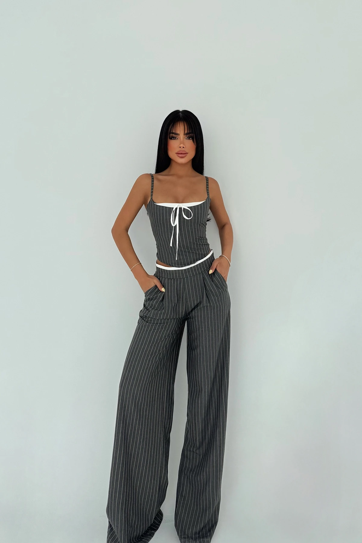 Gray Trouser Suit XS size is used in the image. Striped Cloth Foot-Made of Poplin Fabric. Upper Length: 30 cm Chest: 38 cm Lower Length: 112 cm Waist: 38 cm Model Measurements Height 158 ​​Weight 52 Chest 80 Waist 62 Hip 93