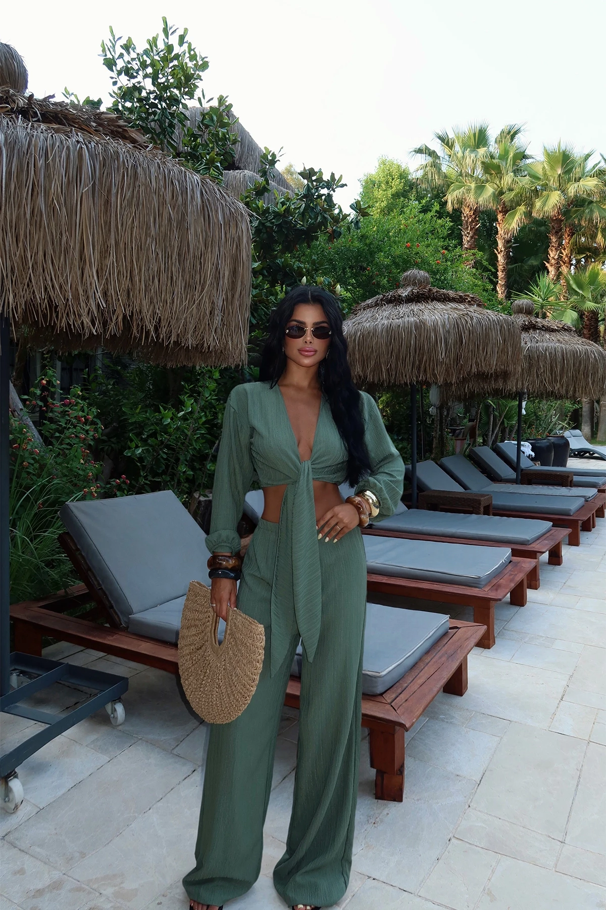 Green Adelina Tie-Up Suit Made of woven Bürümcük fabric. Size XS is used in the image. Suit upper length 36 cm, Chest 43 cm, Bottom length 111 cm, Waist 34 cm, Hips 54 cm Model Measurements Height: 160 Weight: 50 Chest: 80 Waist: 62 Hips: 94