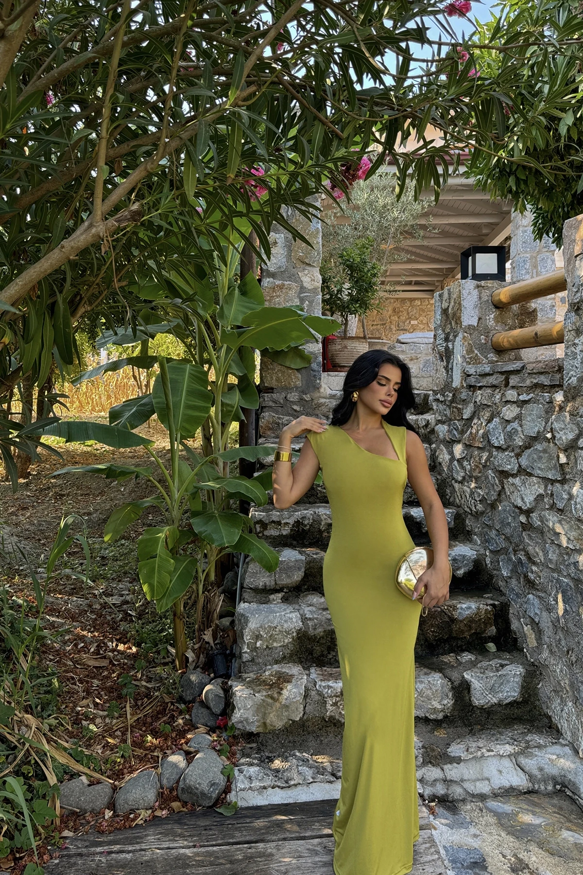 Green Long Dress Size S is used in the image Made of Sandy fabric. Dress length 143 cm Chest 38 cm Waist 30 cm Model Measurements Height: 160 Weight: 50 Chest: 80 Waist: 62