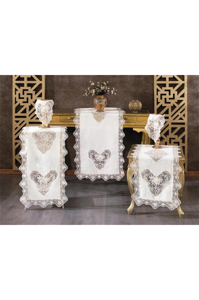 5 Parça Salon Takımı Marka: Çeyiz Diyarı Masa Runner: 90x160 cm / 1 adet Konsol Runner: 40x130 cm / 1 adet Sehpa Runner: 40x100 cm / 1 adet Sehpa Runner: 25x35 cm / 2 adet Keten Kumaştan Üretilmiştir. Salonunuza zerafet ve şıklık katmak yada çeyiziniz için şık bir ürün sahibi olmak için tercih edebilirsiniz. YIKAMA TALİMATI -Makinada veya elde yıkayabilirsiniz max 30 derecede yıkayınız. -Çamaşır suyu ile leke sökücü kimyasallar kullanmayınız. -Yıkama esnasında koyu renkleri mümkün olduğunca ayrı tutunuz. -Ilık ütü ile ütüleyiniz. -Islak bekletmeyiniz. -Kurutma makinasında kurutulabilir.