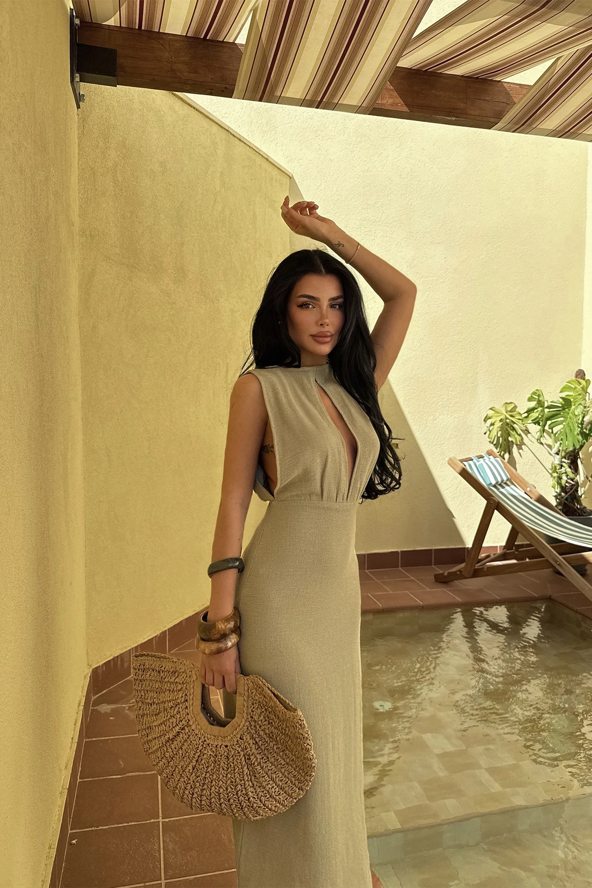 Khaki Himari Dress Size XS is used in the image. Dress Length: 134 Cm Waist: 34 Cm Bust: 37 Cm Model Measurements Height 158 ​​Weight 52 Chest 80 Waist 62 Hip 93