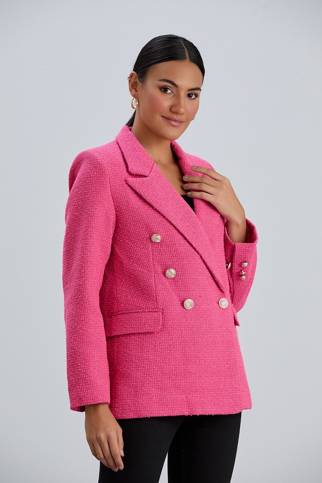 Önden düğme kapamalı, astarlı, süs cep detaylı, uzun kollu, kruvaze tüvit ceket Manken Bilgisi Boy:1.70 Numune Beden: S