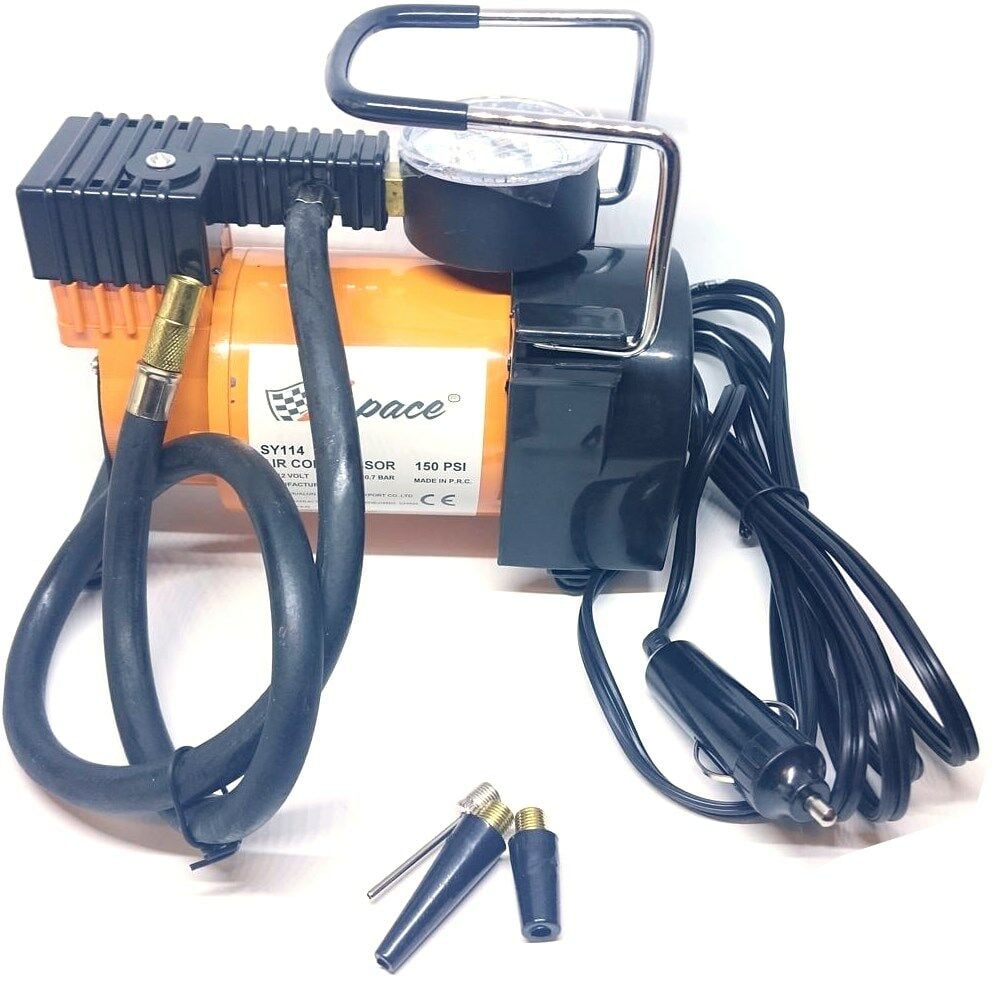 Profesyonel Lastik Şişirme Kompresörü Metal gövdeli ve metal pistonludur. Tüm Bisiklet, motosiklet, bot, otomobil, arazi, hafif ticari, traktör vs... vasıtalar için uygundur. İçinden çıkan aparatlarla bisiklet lastiği ve top şişirmek içinde kullanılabilir. 2,60 cm uzunluğundaki kablosu ile tüm lastiklere ulaşır. Kablo ucundaki çakmak fişinden beslenir. Gövde üzerindeki anahtardan açma - kapama yapılabilir. Üzerinde mini bir basınç saati vardır. 100 PSI basınca kadar şişirme yapabilir. Aşırı ısınmalara karşı otomatik koruma sistemi vardır. Kauçuk ayakları sayesinde titreşimi absorbe eder. Fatura garanti belgesi yerine geçer. Teknik veriler Voltaj: 12V Ortalama tüketim: 14 amp. Hava akımı: 35L/dakika Max. basınç: 10 kg/cm2 (150 psi) Çalışma basıncı: 7 kg/cm2 (130 psi) Ağırlık: 2,2 kg Ölçüler: 167*93*157 cm Ortam sıcaklığı: -20C ~ +80C