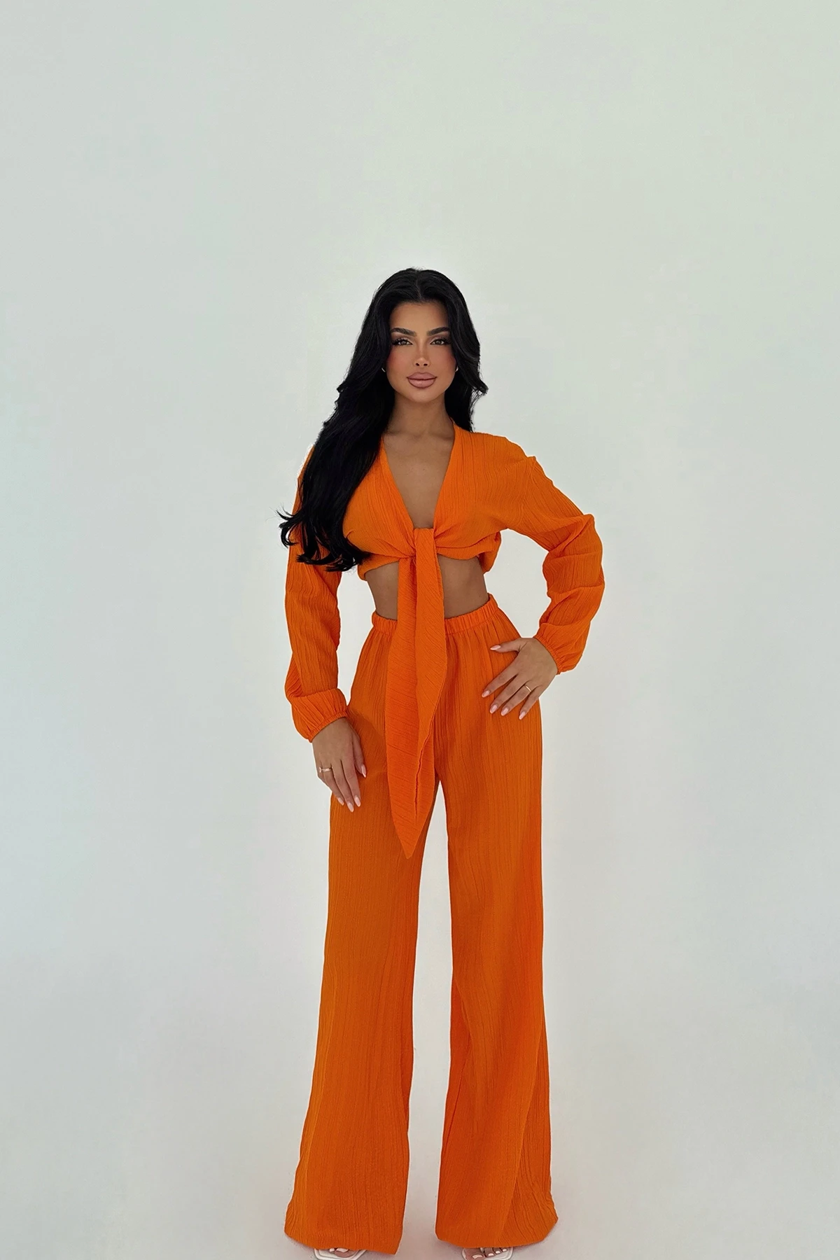 Orange Adelina Tie-Up Suit Made of Woven Bürümcük fabric. The image uses size XS. Suit top length 36 cm, Chest 43 cm, Bottom length 111 cm, Waist 34 cm, Hips 54 cm Model Measurements Height: 160 Weight: 50 Chest: 80 Waist: 62 Hips: 94