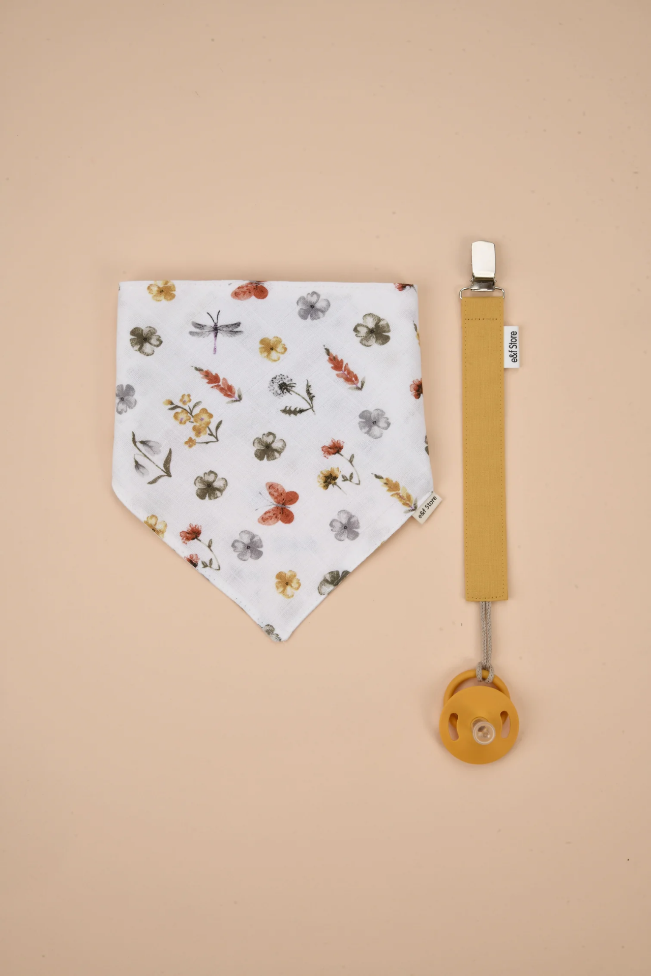 Organik Sertifikalı Çift Katlı Müslin Mama Önlüğü ve %100 Pamuk Hardal Sarısı Emzik Askısı Seti