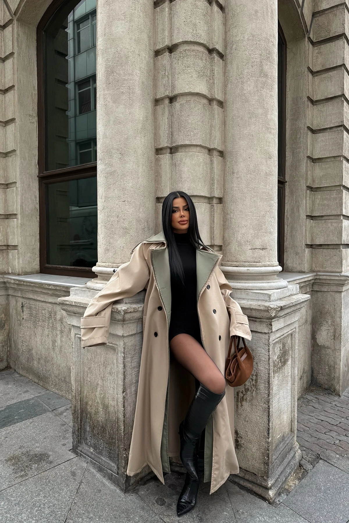 Penny Lane Two Color Trench Coat Height: 133 cm Bust: 55 cm Size XS is used in the image. Model Measurements Height 158 ​​Weight 52 Chest 80 Waist 62 Hip 93