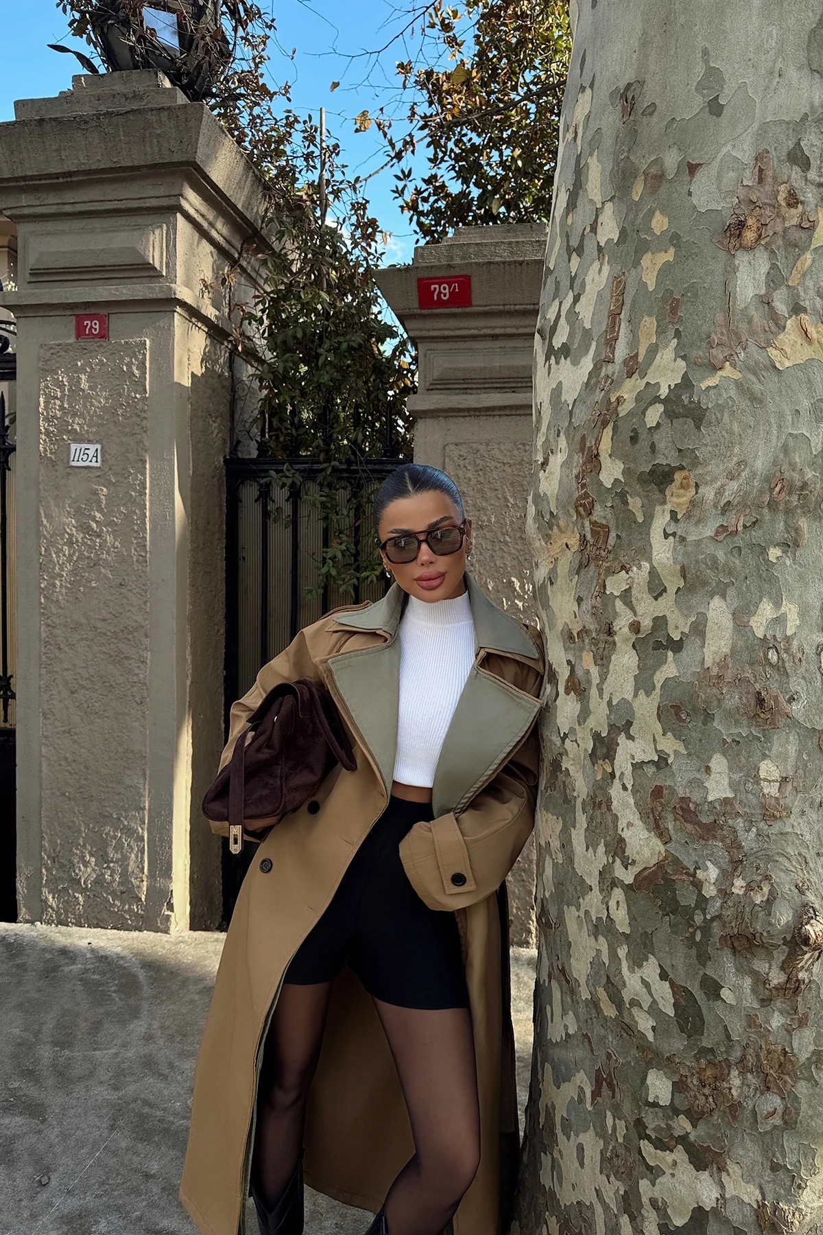 Penny Lane Two Color Trench Coat Height: 133 cm Bust: 55 cm Size XS is used in the image. Model Measurements Height 158 ​​Weight 52 Chest 80 Waist 62 Hip 93