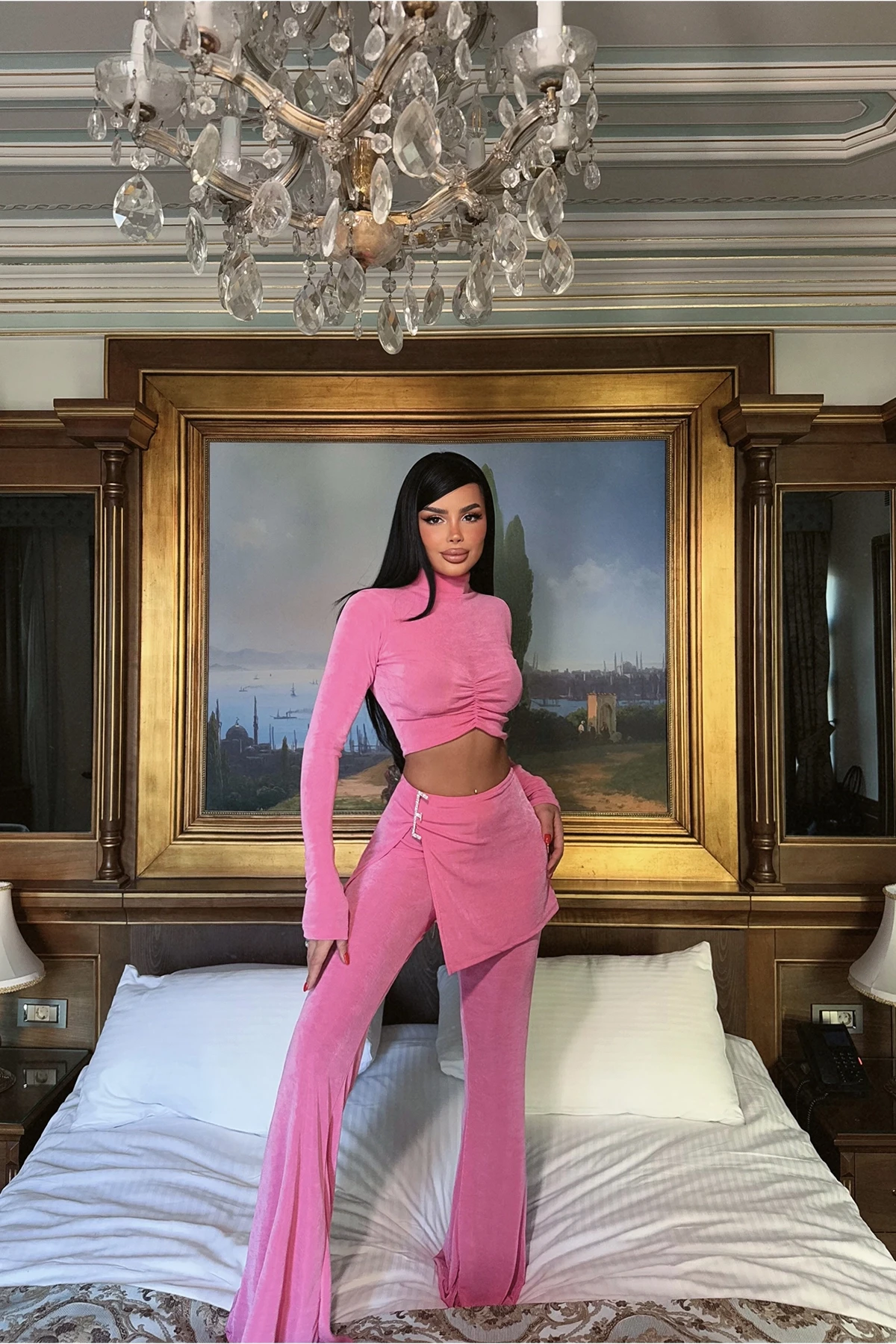 Pink Tiani Stone Accessory Set XS size is used in the image. Made of Buzzy Fabric. Top Length: 39 cm Chest: 35 cm Bottom Length: 105 cm Waist: 39 cm Model Measurements Height 158 ​​Weight 52 Chest 80 Waist 62 Hip 93