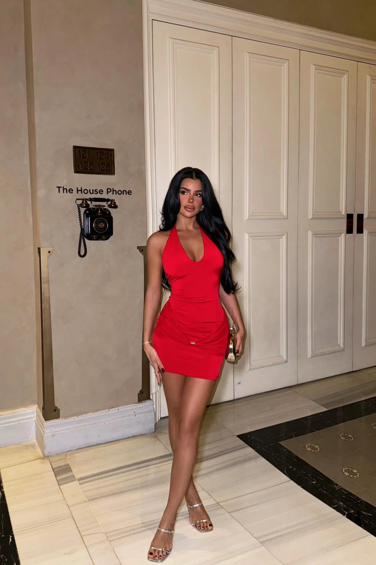 Red Belt Detail Mini Dress Size XS is used in the image. Made from Sandy Fabric. Height: 84 Cm Waist: 31 Cm Bust: 33 Cm Model Measurements Height 158 ​​Weight 52 Chest 80 Waist 62 Hip 93