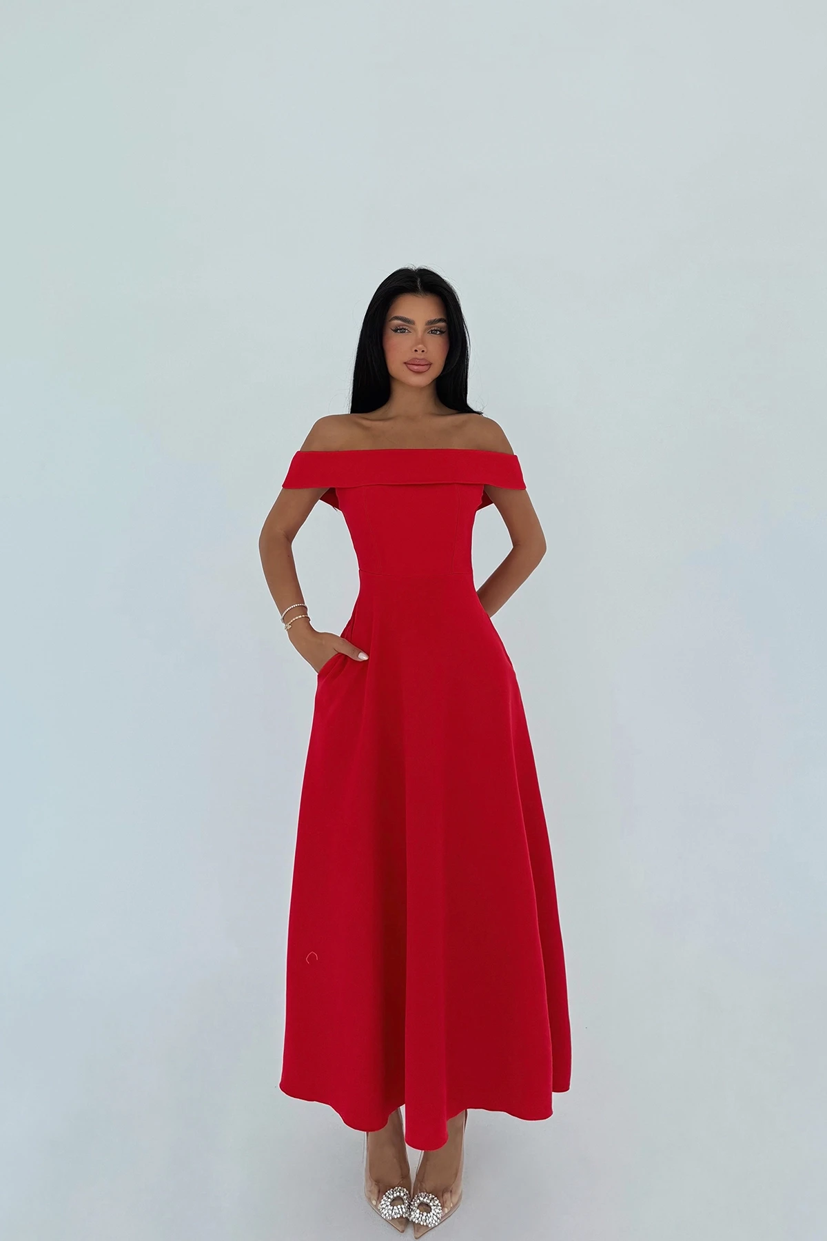 Red Madonna Collar Dress Made of Double Fabric. The image uses size XS. Length: 110 cm Waist.31 cm Chest: 54 cm Model Measurements Height 158 ​​Weight 52 Chest 80 Waist 62 Hip 93