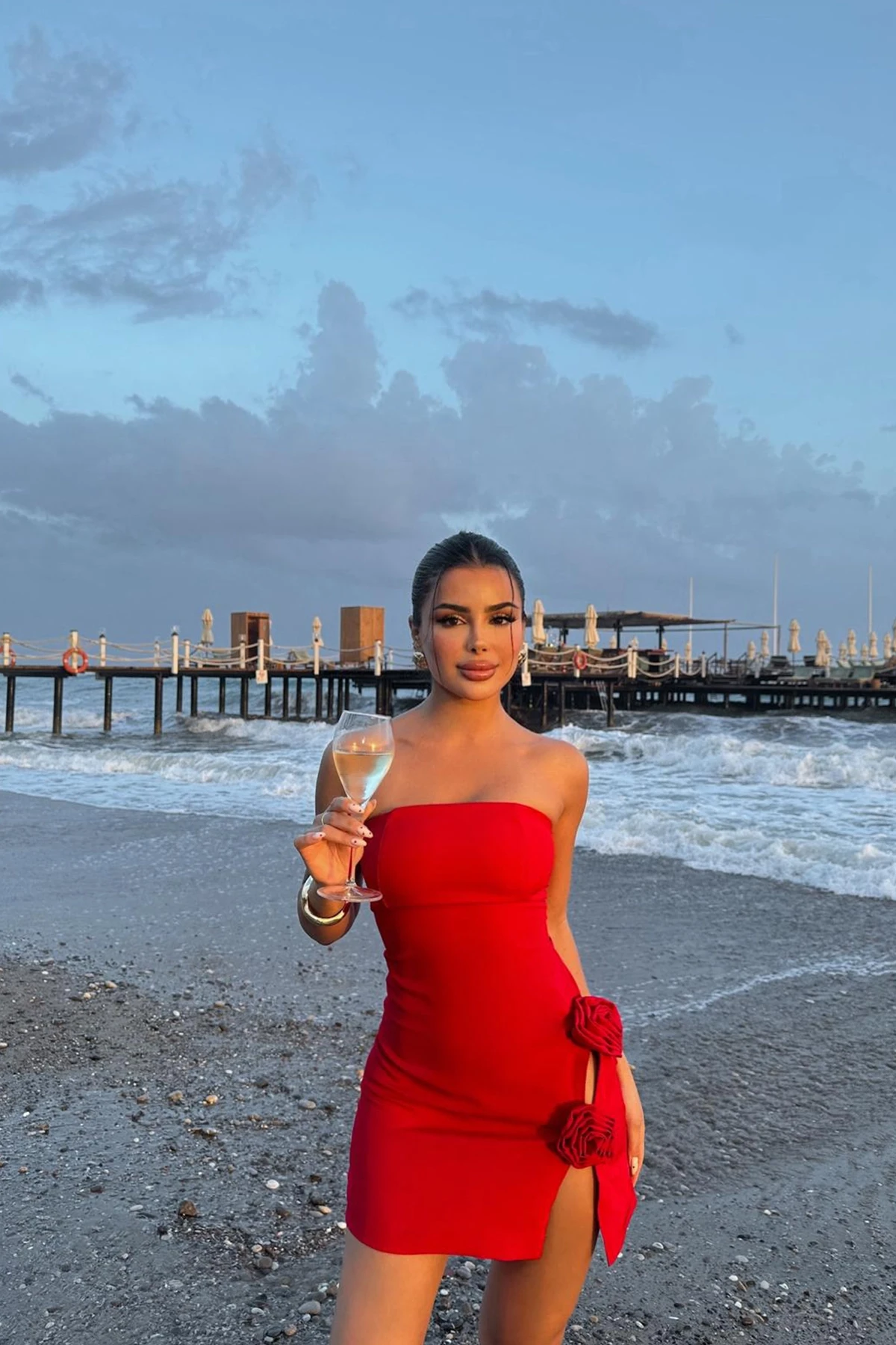 Red Rose Detail Mini Dress Made from Atlas Fabric Image size S is used Dress Length: 61cm Bust:31cm Waist:33cm Model Measurements: Height: 160 Weight: 50 Chest: 80 Waist: 62 Hip: 94