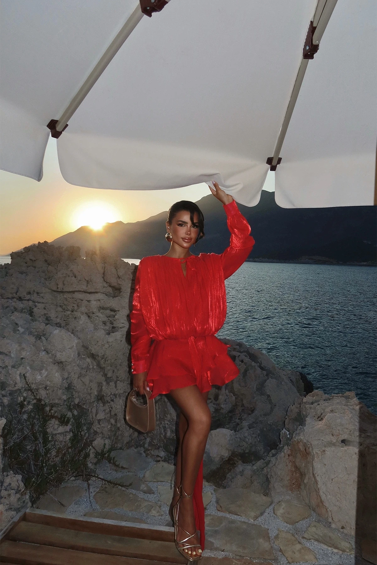 Red Salerno Mini Dress XS size is used in the image. Made of Silk Yoryo-Polyester Lining Fabric. Length: 83 cm Waist: 38 cm Chest: 56 cm Model Measurements Height 158 ​​Weight 52 Chest 80 Waist 62 Hip 93