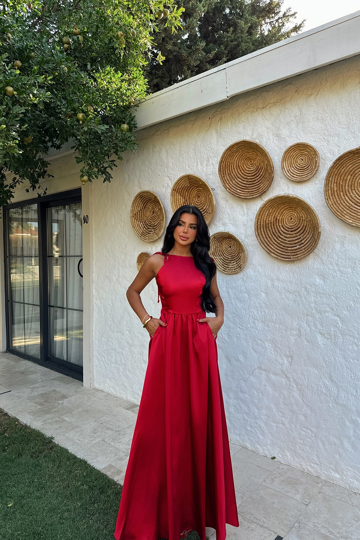 Red Satin Back Detail Long Dress