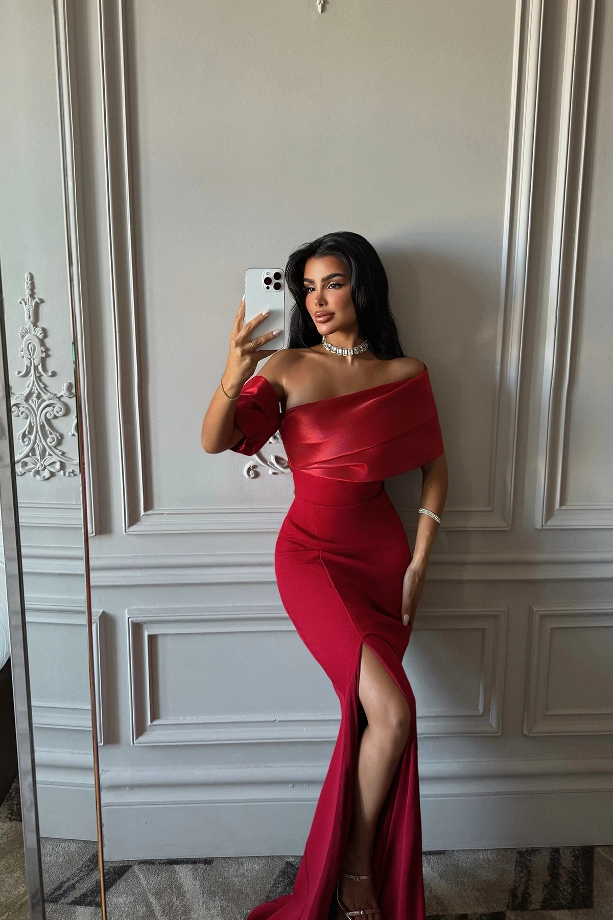 Red Strapless Long Evening Dress Size XS is used in the image. Height: 145 cm, Waist: 31 cm, Chest: 46 cm Model Measurements: Height: 158 cm, Weight: 52 cm, Chest: 80 cm, Waist: 62 cm, Hips: 93 cm