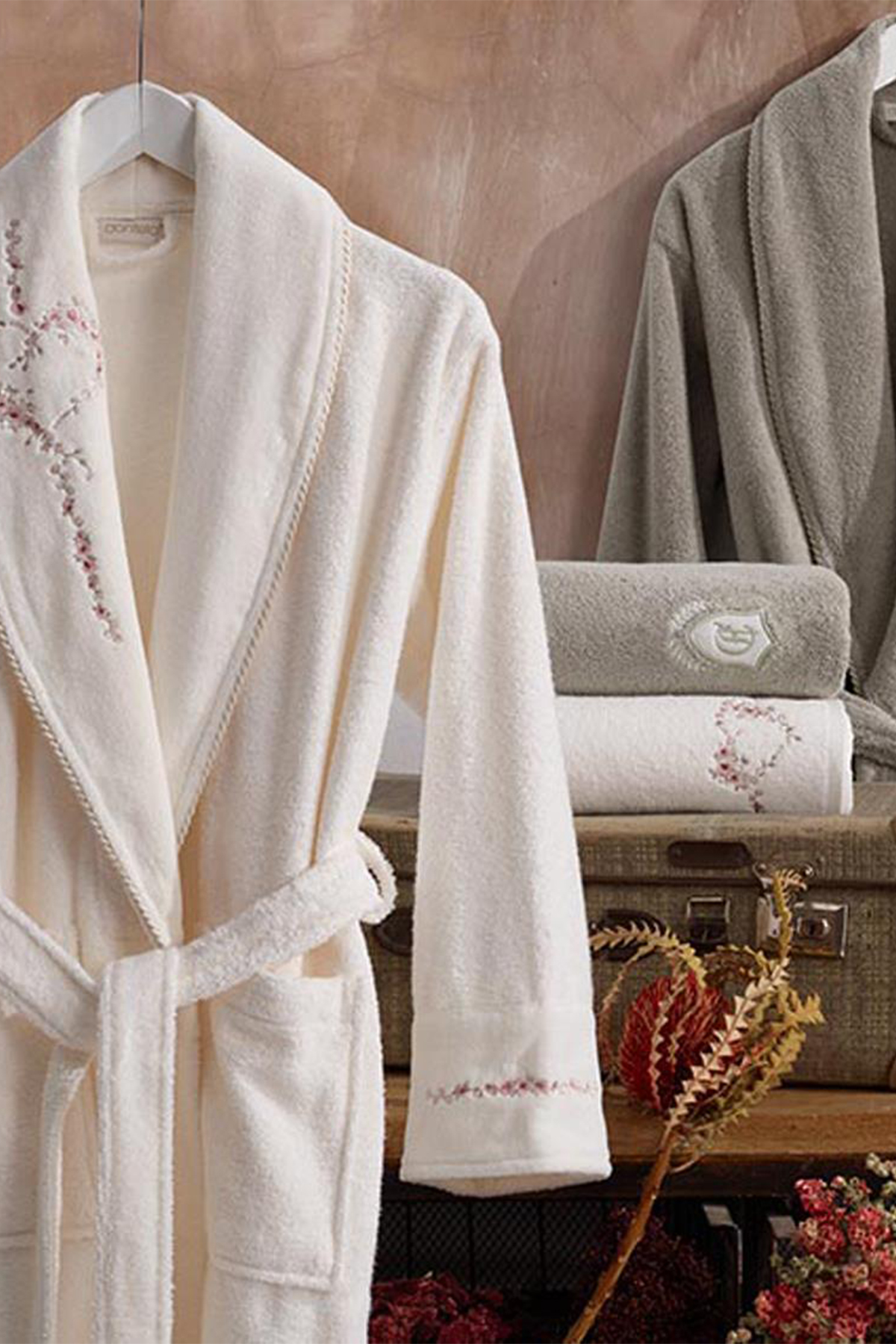 Sare Lüks Nakışlı Pamuk Bornoz Takımı Krem Bej