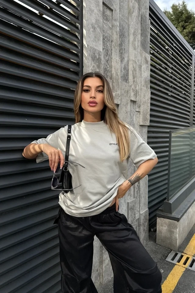 Stone Front T-Shirt It is made of combed cotton fabric. Size S is used in the image. T-shirt length is 70 cm, chest is 55 cm. Model Measurements: Height: 171 Weight: 55 Chest: 85 Waist: 65 Hip: 105