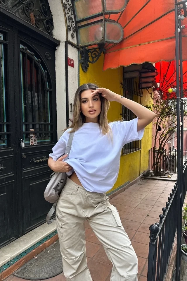 White Back Printed T-Shirt It is made of combed cotton fabric. Size S is used in the image. T-shirt length 70 cm, Chest 55 cm, Shoulder 52 cm Model Measurements: Height: 171 Weight: 55 Chest: 85 Waist: 65 Hip: 105