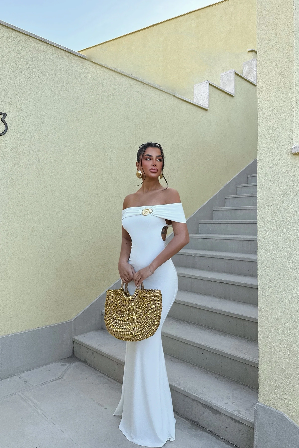 White Brooch Detail Dress Made of Sandy Fabric. The image shows size XS. Length: 140 cm Waist: 33 cm Chest: 37 cm ​Model Measurements Height 158 ​​Weight 52 Chest 80 Waist 62 Hip 93
