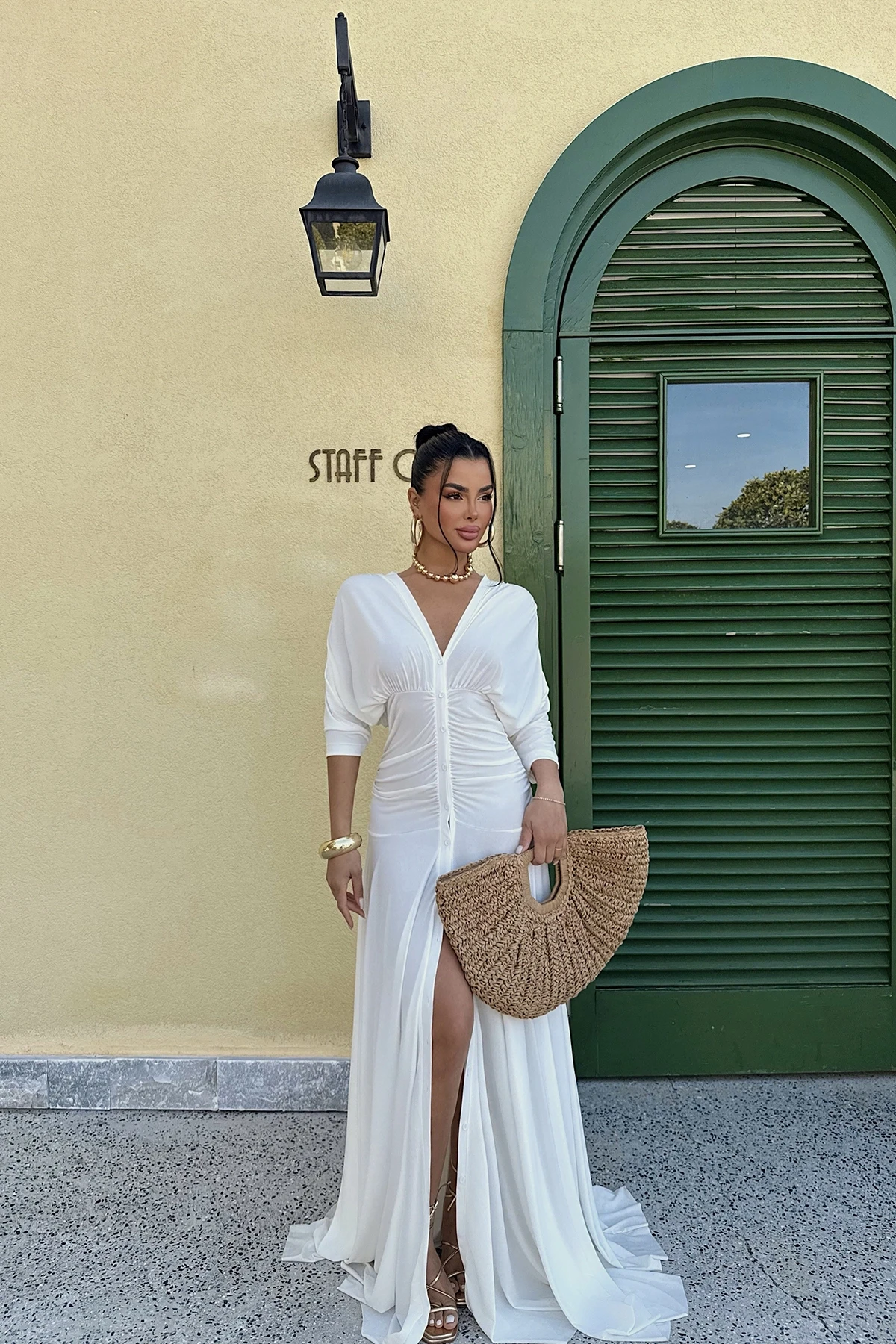 White Eliah Long Buttoned Dress XS size is used in the image. Made of Sandy Fabric. Length: 168 cm Waist: 30 cm Chest: 36 cm ​Model Measurements Height 158 ​​Weight 52 Chest 80 Waist 62 Hip 93