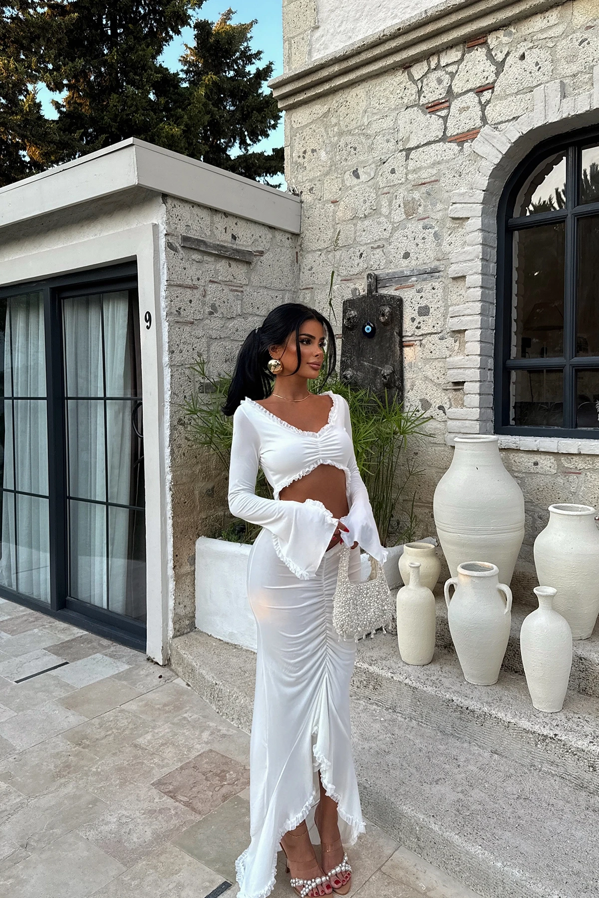 White Window Detail Long Dress It is made of sandy fabric. Size S is used in the image. Dress Length: 139 Cm, Chest: 35 Cm, ​​Waist: 23 Cm, Hip: 37 Cm Model Measurements: Height: 160 Weight: 50 Chest: 80 Waist: 62 Hip: 94