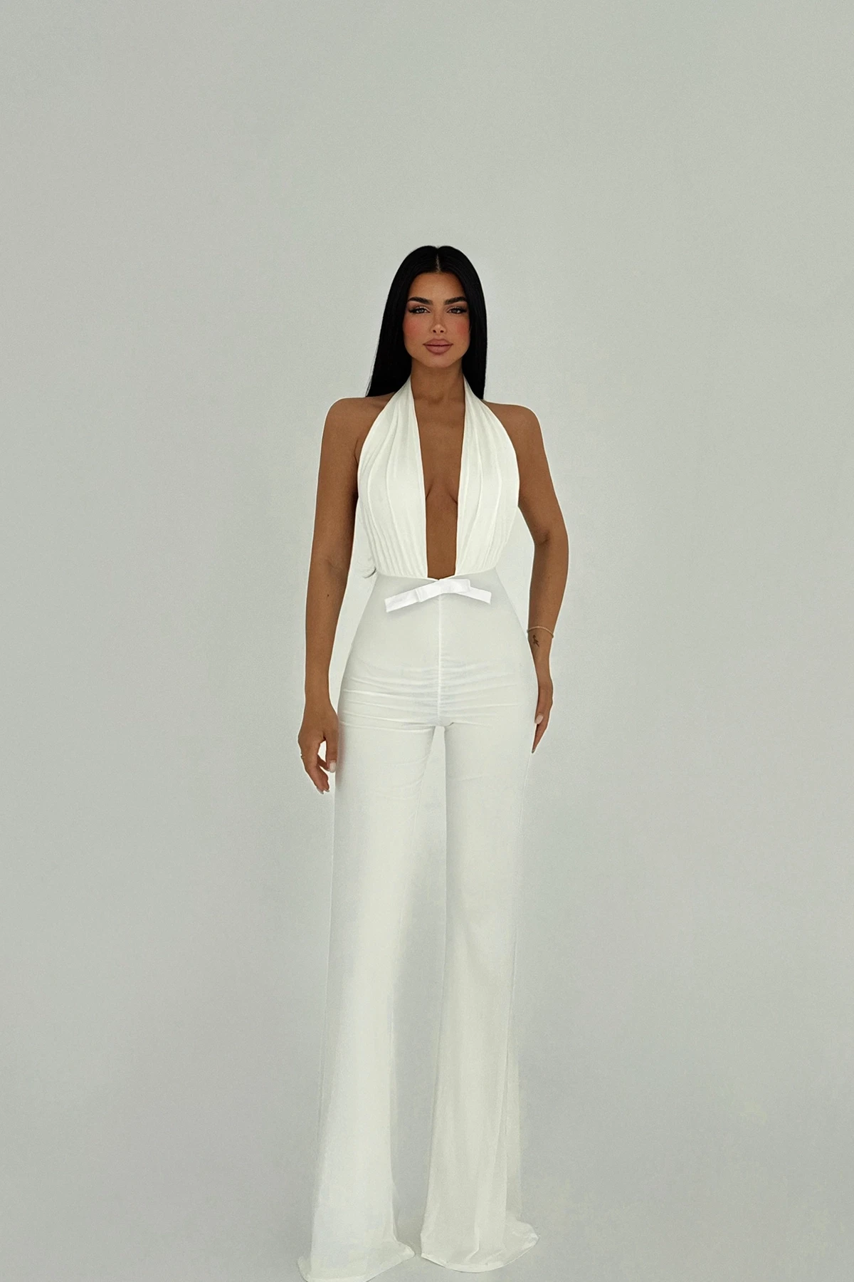 White Maly Jumpsuit Made of Sandy Fabric. XS size is used in the image. Height: 145 cm Waist: 30 cm Chest: 33 cm Model Measurements Height 158 ​​Weight 52 Chest 80 Waist 62 Hip 93