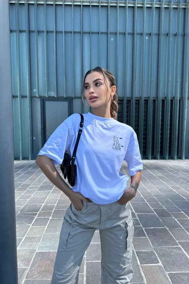 White Oversize Printed T-Shirt Made from combed cotton fabric Size S is used in the image T-Shirt Length: 75 Cm Chest: 60 Cm Model's Measurements: Height: 171 Weight: 55 Chest: 85 Waist: 65 Hip: 105