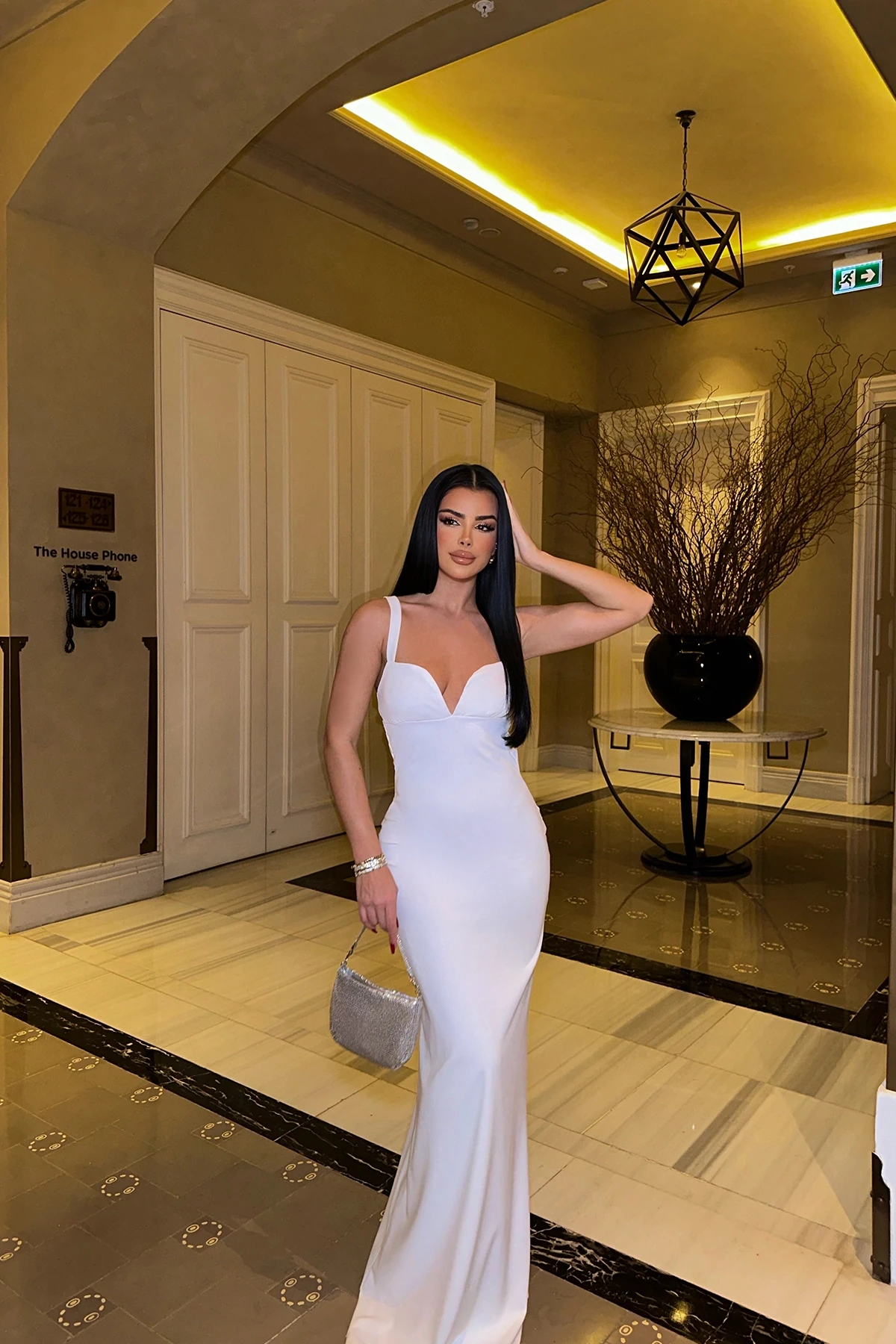 White Strap Dress Made from durable fabric Size S is used in the image. Dress Length: 158cm Bust: 34cm Model's Measurements: Height: 160 Weight: 50 Chest: 80 Waist: 62 Hip: 94